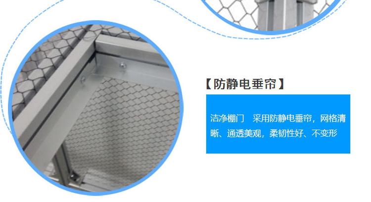 2.防靜電掛簾:四周使用防靜電掛簾(或鋼化玻璃),防靜電效果好,透明度高,網(wǎng)格清晰,柔韌性好,不變形,不老化;